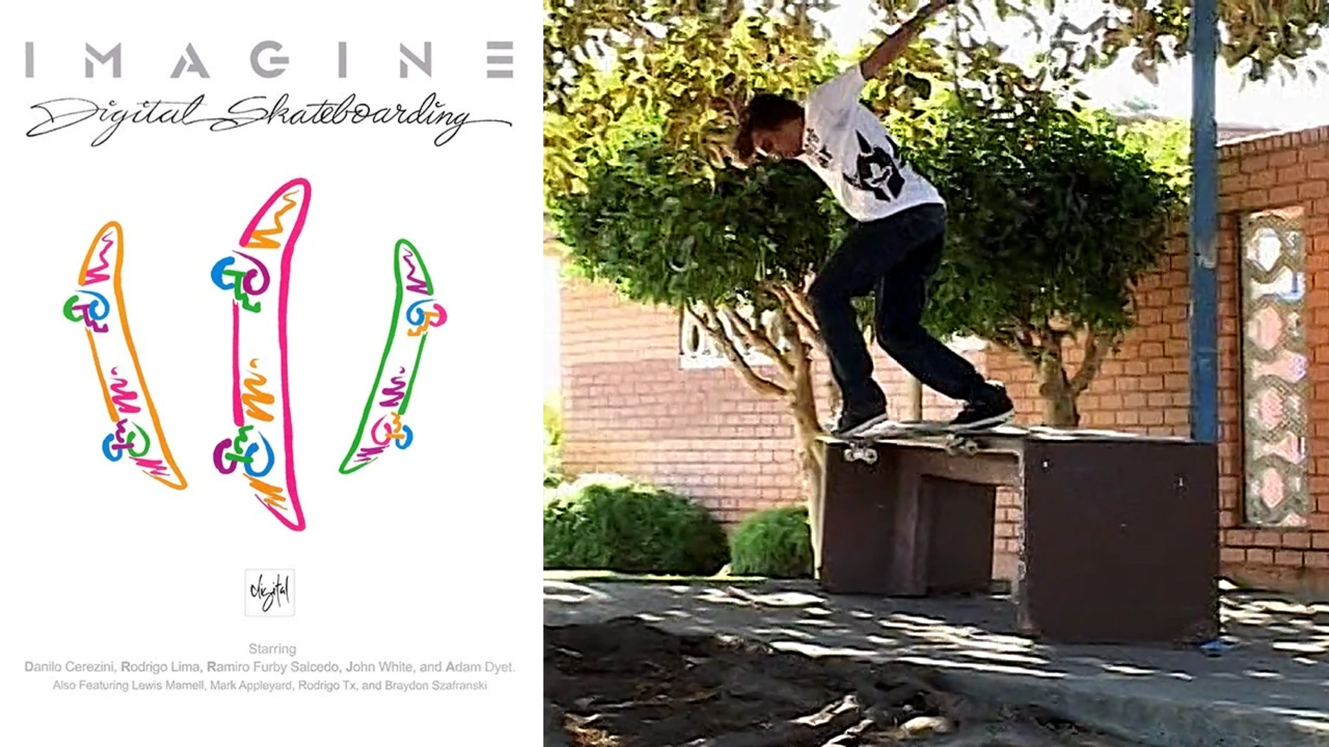 Digital Skateboarding Presents: “Imagine”Produced by Dennis Martin and Bill Weiss for Digital Skateboarding. Featuring Aaron Artis, Aaron Snyder, Adam Dyet, Adelmo Jr., Andrew Gourdouros, Andrew Pott, Antwuan Dixon, B Sheppard, Bjorn Johnston, Braydon Szafranski, Brazilian Man, Caswell Berry, Chima